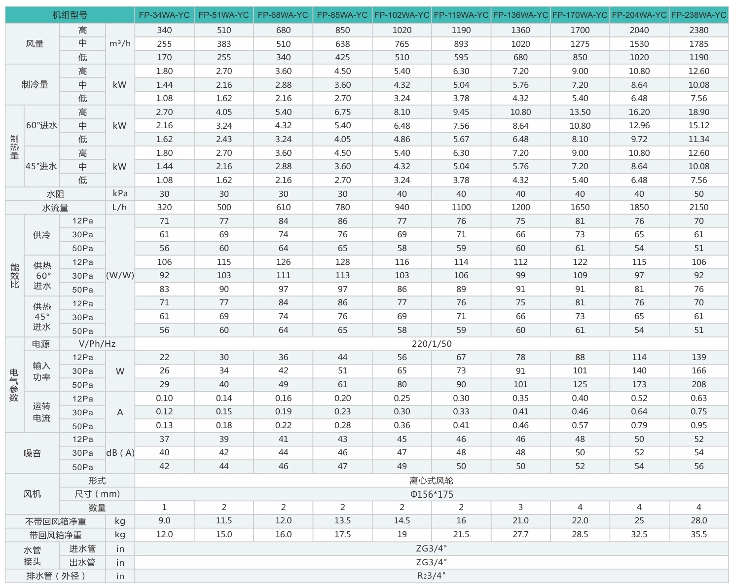 供冷量是在進(jìn)風(fēng)干球溫度27℃,濕度溫度19.5℃,進(jìn)水溫度7℃,出水溫度12℃條件下測(cè)試所得。